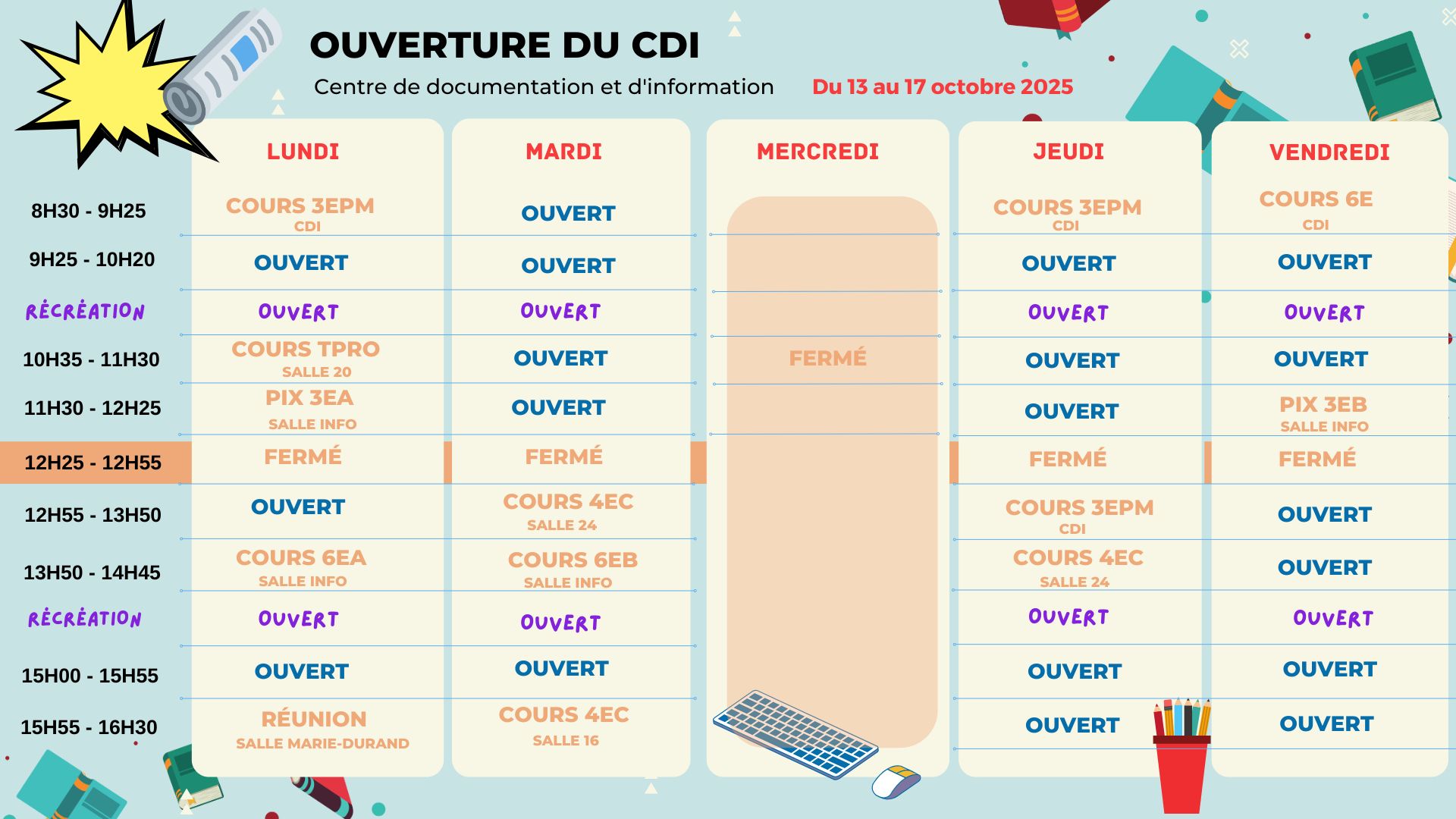 Le CDI vous accueille lundi, mardi, jeudi et vendredi de 8h30 à 16h30. Vous y découvrirez plusieurs espaces : lecture, travail, dessin, radio et jeux.
